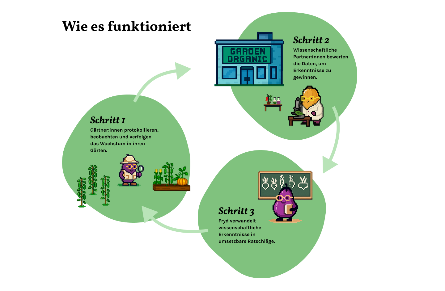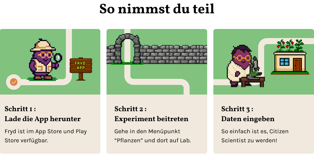 Zusammen mit Partnern wie Garden Organic entwickeln wir leicht verständliche und breit zugängliche Experimente, die du einfach in deinen Alltag integrieren kannst. Fryd Lab sammelt die Daten, unsere wissenschaftlichen Partner werten und bereiten sie auf. Aus den Datensätzen werden dann anschließend dynamische Handlungsempfehlungen für deine Region und deinen Garten abgeleitet. So entsteht Schritt für Schritt eine lebendige Datengrundlage aus echten Gärten, die fortlaufend aktualisiert wird.